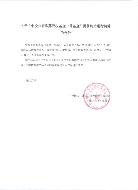 关于中投普惠私募股权基金一号基金提前终止进行清算的公告